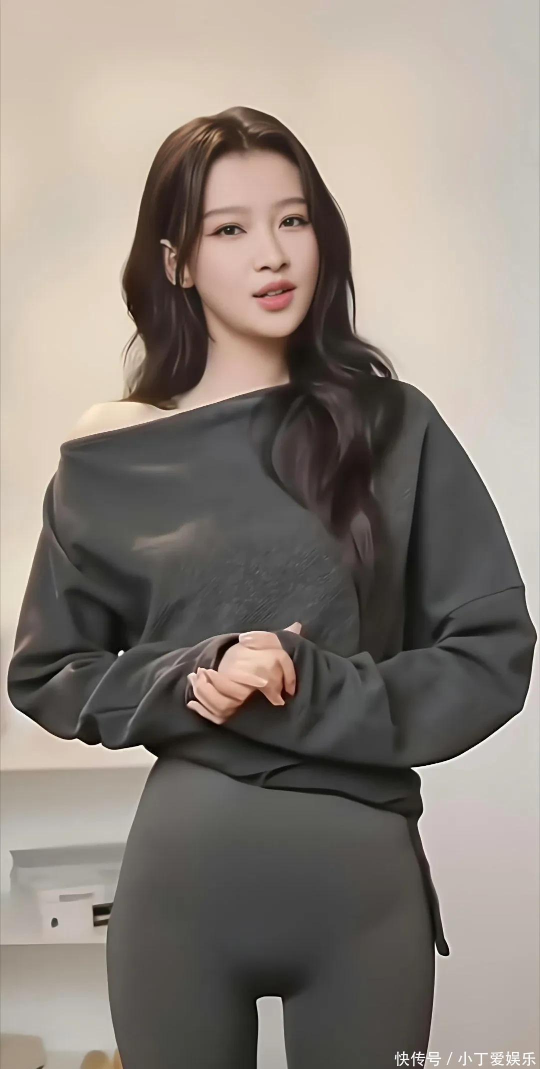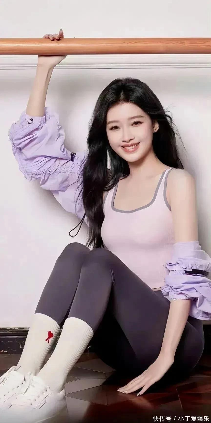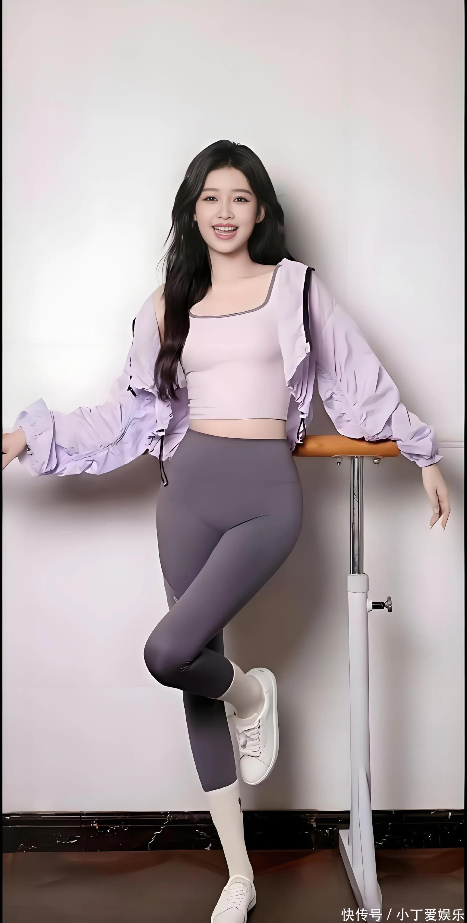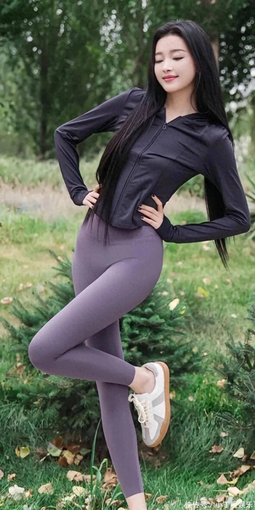 看见她公园那一身,我第一反应:这姐是不是偷偷开了会员的长腿特效?!浅杏色开衫配紫灰色瑜伽裤,颜色温温柔柔的,但那个腿啊,又长又直,线条顺得跟开了滑溜滤镜似的。